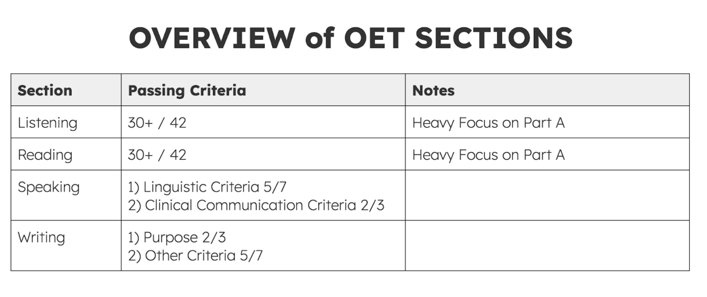 This section-based requirement reflects how OET is used in real clinical settings.