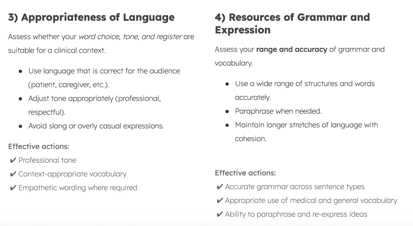 In practical terms, the exam looks beyond general English and focuses on how effectively you use English in clinical interactions—the kind of communication expected in real consultations, not abstract discussion.