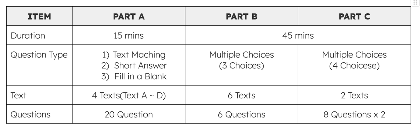 The Reading test consists of three parts completed within a total of 60 minutes.